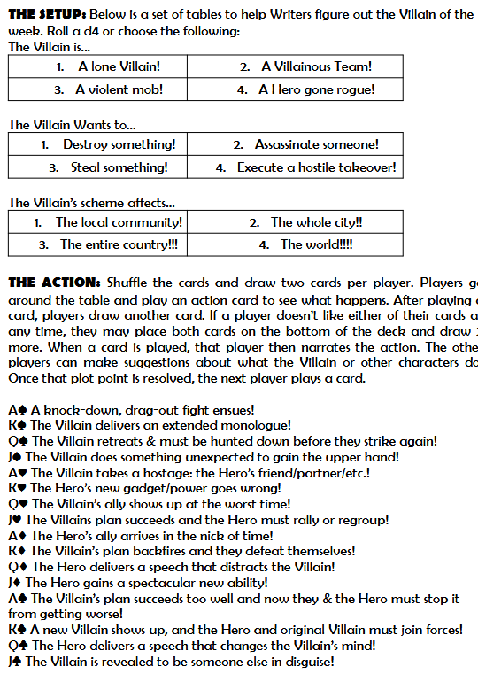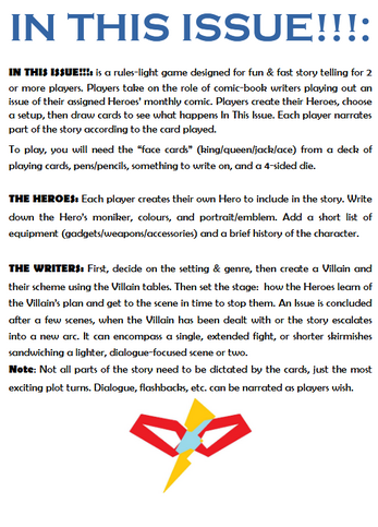 IN THIS ISSUE...!!!: sets players as comic book writers crafting the latest issue of their monthly title. Create some Heroes and a set up, then draw cards to see what shocking twists and exciting turns the plot takes! How do the heroes get through this infinite crisis? Will they wage a secret war or will they yearn for days of future past? Find out IN THIS ISSUE...!!!